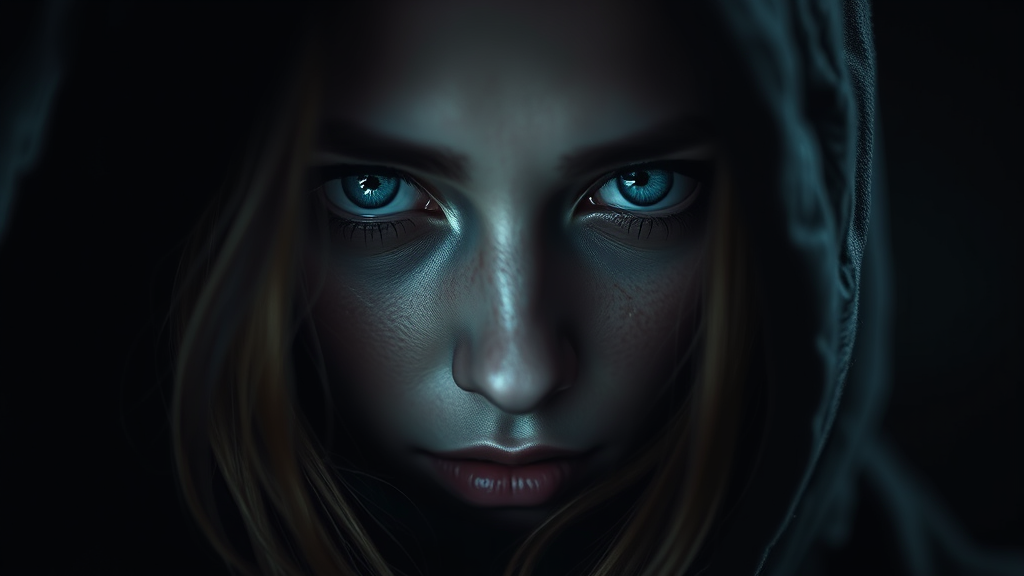 Hyperrealistic portrait of an enigmatic woman with mesmerizing ice-blue eyes, enveloped in a shadowy aura, captivating and haunting. The scene features subtle lighting, creating a dark and atmospheric mood, with a pronounced depth of field highlighting her intricate details.