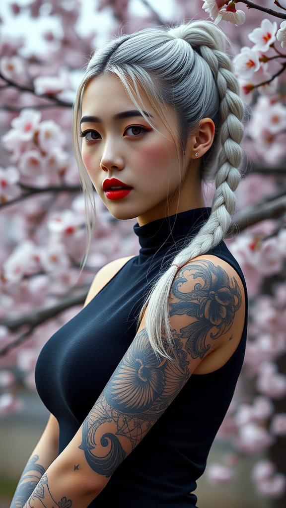 Hyperrealistic portrait of an exquisite Korean K-pop idol featuring a striking white braided ponytail, detailed full sleeve tattoo, and bold red lips. The idol is dressed in a sleek, form-fitting black sleeveless bodysuit, set against a stunning backdrop of cherry blossoms. Captured with a Canon R5 and 200mm lens, the image is in sharp focus and shot in RAW format, showcasing a highly intricate, photorealistic 8k HD quality face. This professional photo highlights lifelike skin textures and rich colors with dramatic, cinematic lighting, evoking realistic, high-contrast imagery. Trending on Artstation, the detailed 8k resolution photograph adopts physics-based rendering to produce a masterpiece of photorealism, akin to a Kodak Portra 400 film stock aesthetic. The lighting and textures provide a cinematic feel, bridging traditional photography techniques with digital arts, digital painting, and rendering styles for a captivating result.