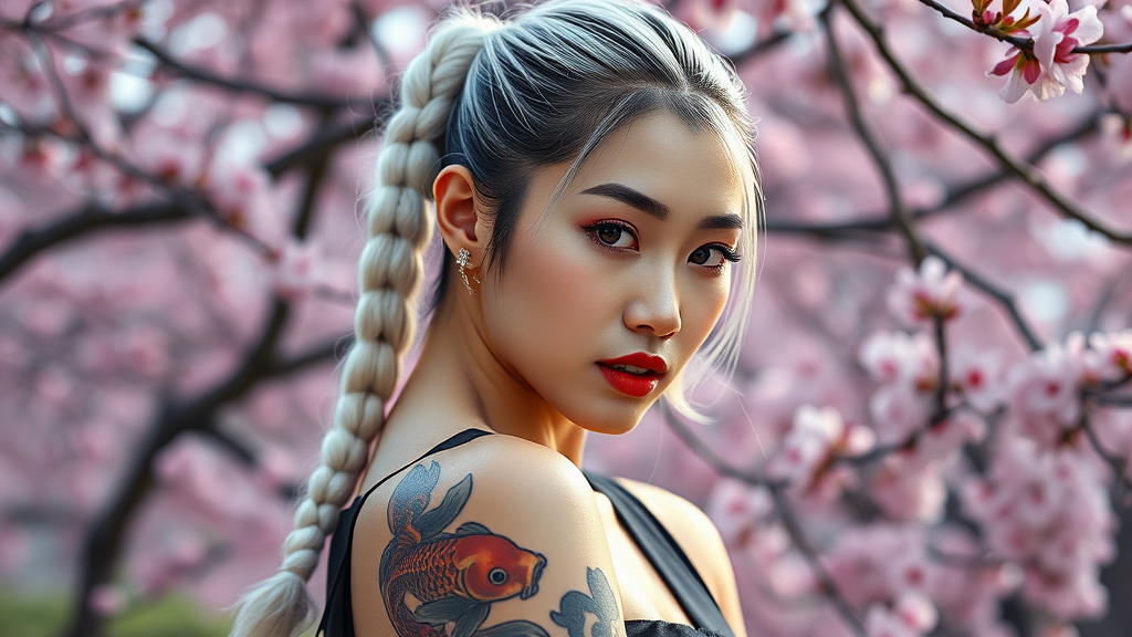 Hyperrealistic portrait of an exquisite Korean K-pop idol with a sleek white braided ponytail and striking red lips, adorned with a full sleeve koi fish tattoo. She wears a form-fitting all-black sleeveless dress, set against a stunning landscape of cherry blossoms. Captured using a Canon R5 with a 200mm lens, this sharp-focused photograph is shot in RAW format, highlighting a meticulously detailed face in 8K HD quality. Featuring superior color range, the high-resolution image showcases lifelike skin textures and dramatic lighting, echoing a cinematic masterpiece. Trending on Artstation, this photorealistic digital artwork embodies ultra-high resolution detail and professional-grade photographic quality, capturing the essence of realism and unparalleled artistry.