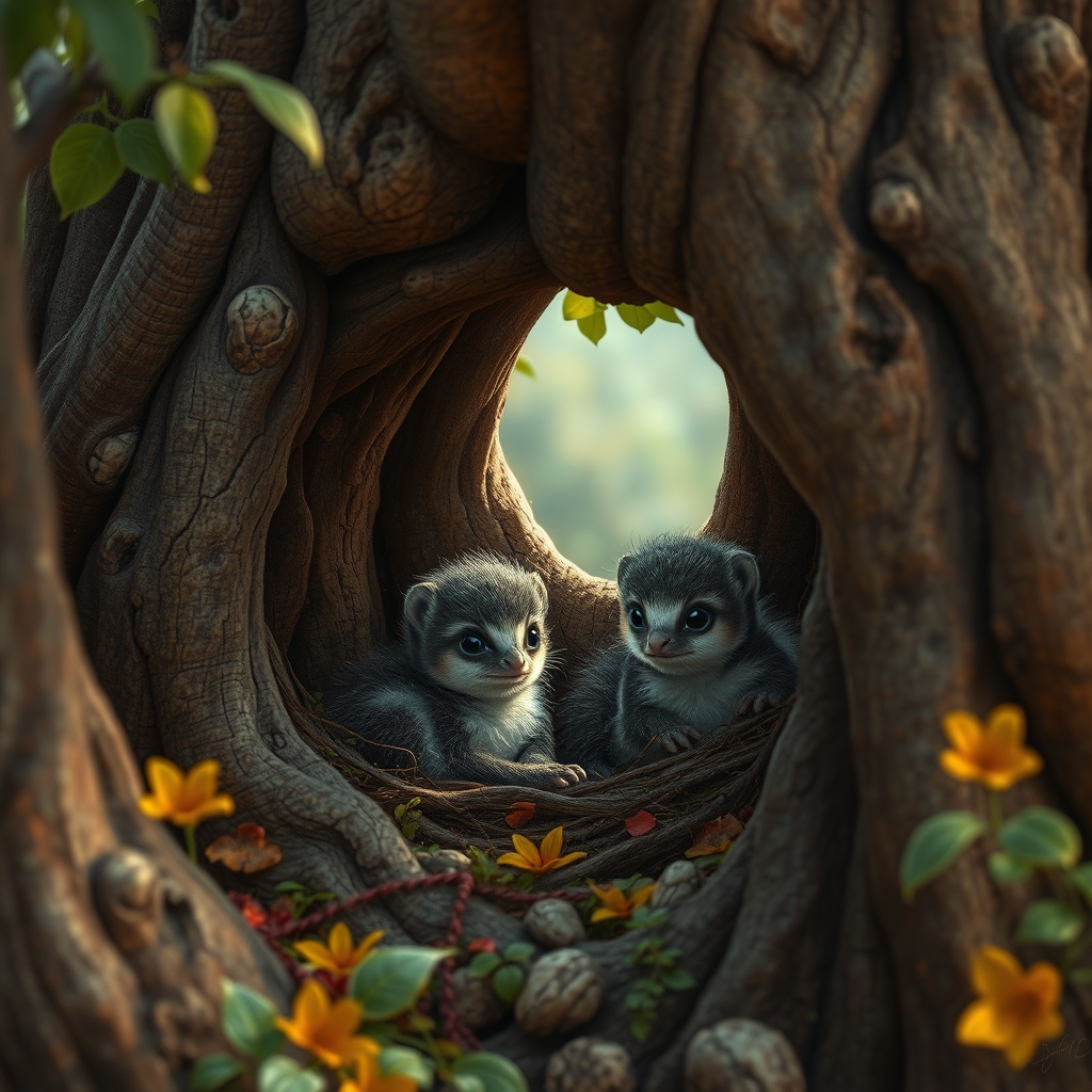Hyperrealistic wildlife scene featuring two baby creatures nestled in the hollows of ancient trees, infused with avian themes. Styled reminiscent of Stephen Shortridge's emotive tones, Lilia Alvarado's enchanting storytelling essence, and Bob Eggleton's attention to intricate depth. The setting is detailed with vibrant flora and fauna, capturing the essence of raw, untouched nature. The study echoes the delicate interplay of light and shadow, highlighting minute details like the soft texture of feathers and bark. With an aspect ratio of 53:89, this artwork is a masterclass in wildlife portraiture, imbued with a sense of innocence and the bustling life inherent in untouched wilderness.