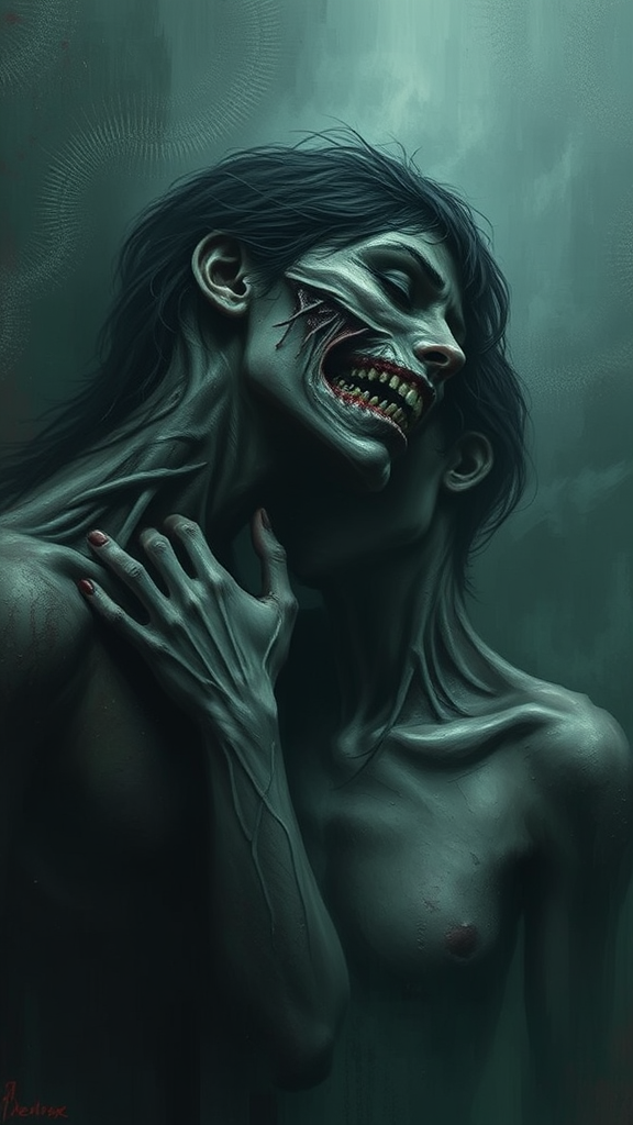 I desired only to love you, creating a heartbreaking and evocative piece with nostalgic imagery, a digital painting exuding drama and gloom, capturing profound emotions with volumetric lighting and intense, brooding dark tones that leave a lasting, haunting impact on the viewer's psyche—an unforgettable masterpiece of high quality. The piece might include text but is combined with worst quality, low quality aspects such as jpeg artifacts, duplications, morbid and mutilated elements, poorly rendered forms, mutations, blurry features, dehydration, and disfigured anatomy with disproportionate and malformed limbs. Additional elements could be extra or missing limbs, extended necks, and disfigured faces. Visual distractions like cameras, names, signatures, watermarks, logos, or marks with a cut-off or censored effect are integrated, highlighting bad anatomy, body, and facial features, as well as exaggerated deformities and bad teeth.
