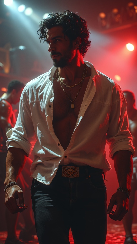 I had a dream... I was in a nightclub, and there were people on the dancefloor. The lights were bright and blinking, pulsing. The music was booming and the Bass was bumping. Then I saw him on the dancefloor... Guido. tall, masculine, rugged, handsome, sexy. Italian heritage. Muscular, fit, athletic. Dark black wavy hair, short on the sides and back, longer on top and combed back. Silky white shirt, unbuttoned to his navel, gold chains around his neck, tight black jeans revealing a bulge in his crotch. His moves were erotic and sensuous, grinding his hips and thrusting his pelvis. I could smell his cologne across the room, Sweat running down his body. C'mon, Guido, take off that shirt, I wanna see that muscular chest. I love the way your thighs are testing the denim of those jeans. Raise your arms, lemme see those hairy pits. I wanna lick the sweat from your body. Show me what you've got. He was about to do just that before I woke up...