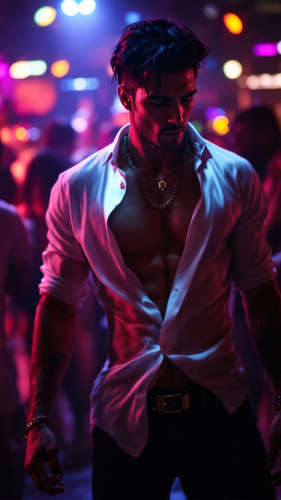 I had a dream... I was in a nightclub, and there were people on the dancefloor. The lights were bright and blinking, pulsing. The music was booming and the Bass was bumping. Then I saw him on the dancefloor... Guido. tall, masculine, rugged, handsome, sexy. Italian heritage. Muscular, fit, athletic. Dark black wavy hair, short on the sides and back, longer on top and combed back. Silky white shirt, unbuttoned to his navel, gold chains around his neck, tight black jeans revealing a bulge in his crotch. His moves were erotic and sensuous, grinding his hips and thrusting his pelvis. I could smell his cologne across the room, Sweat running down his body. C'mon, Guido, take off that shirt, I wanna see that muscular chest. I love the way your thighs are testing the denim of those jeans. Raise your arms, lemme see those hairy pits. I wanna lick the sweat from your body. Show me what you've got. He was about to do just that before I woke up...