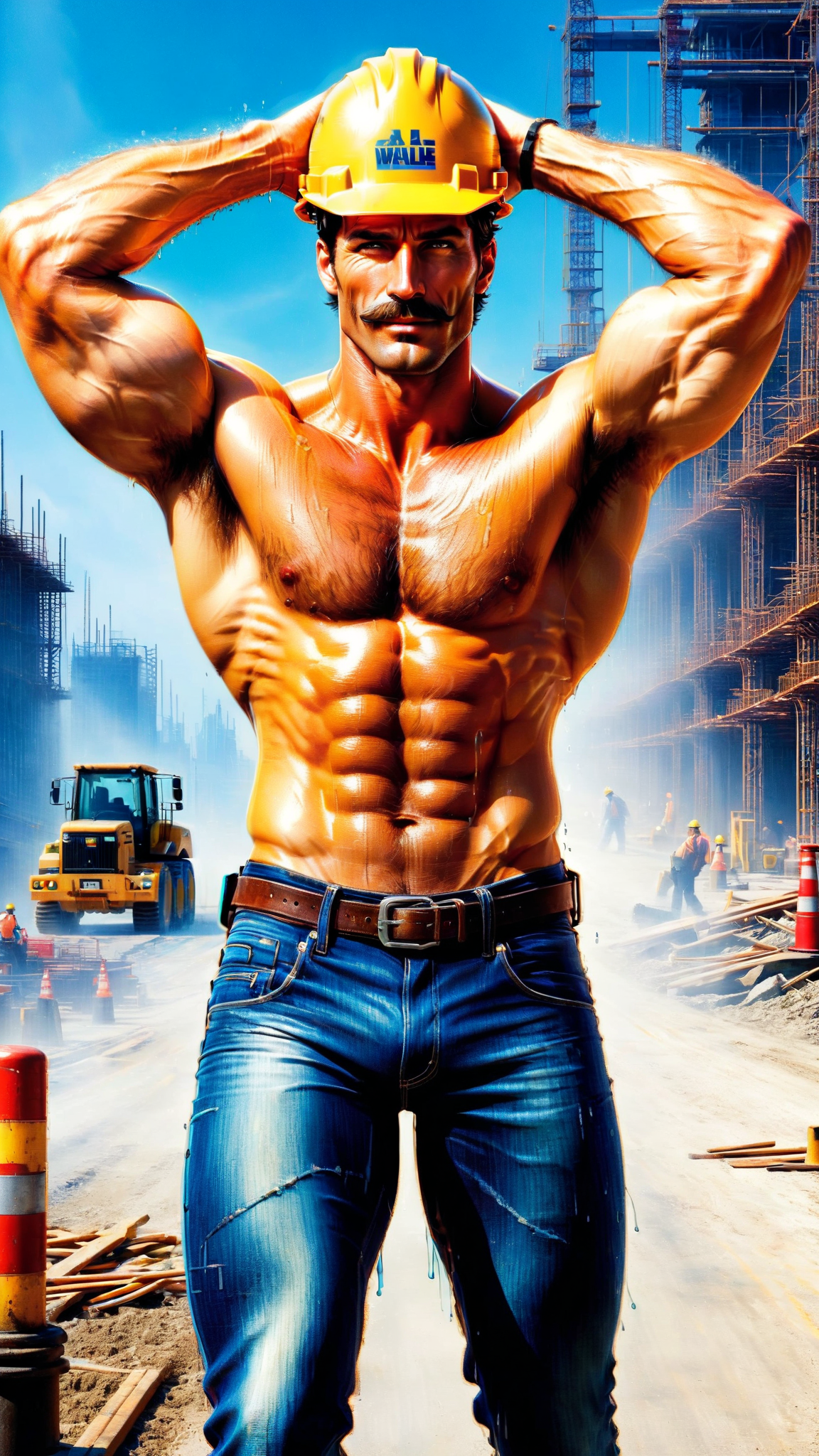 I had a dream that I was walikg by a construction site, and I saw the sexiest, most handsome construction worker there. He was a tall Caucasian male with dark brown hair, blue eyes and a mustache. He wore a bright yellow hard hat on his head. It was hot and muggy out, so he had taken off his shirt. The sun glinted off his sweaty body, the hair on his chest and under his arms wet with perspiration. His muscles were big and his body fit, his jeans were dirty but they hugged his well muscled legs, them also soaked with sweat. He saw me looking at him and I thought he'd be offended-- he smiled at me and flexed his arms, his armpits and hairy chest visible. After his brief show, he turned around and went back to work. I still cary thst memory with me, fondly...