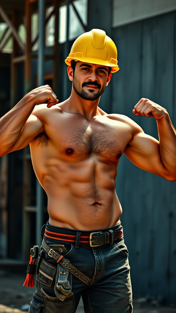 I had a dream that I was walikg by a construction site, and I saw the sexiest, most handsome construction worker there. He was a tall Caucasian male with dark brown hair, blue eyes and a mustache. He wore a bright yellow hard hat on his head. It was hot and muggy out, so he had taken off his shirt. The sun glinted off his sweaty body, the hair on his chest and under his arms wet with perspiration. His muscles were big and his body fit, his jeans were dirty but they hugged his well muscled legs, them also soaked with sweat. He saw me looking at him and I thought he'd be offended-- he smiled at me and flexed his arms, his armpits and hairy chest visible. After his brief show, he turned around and went back to work. I still cary thst memory with me, fondly...