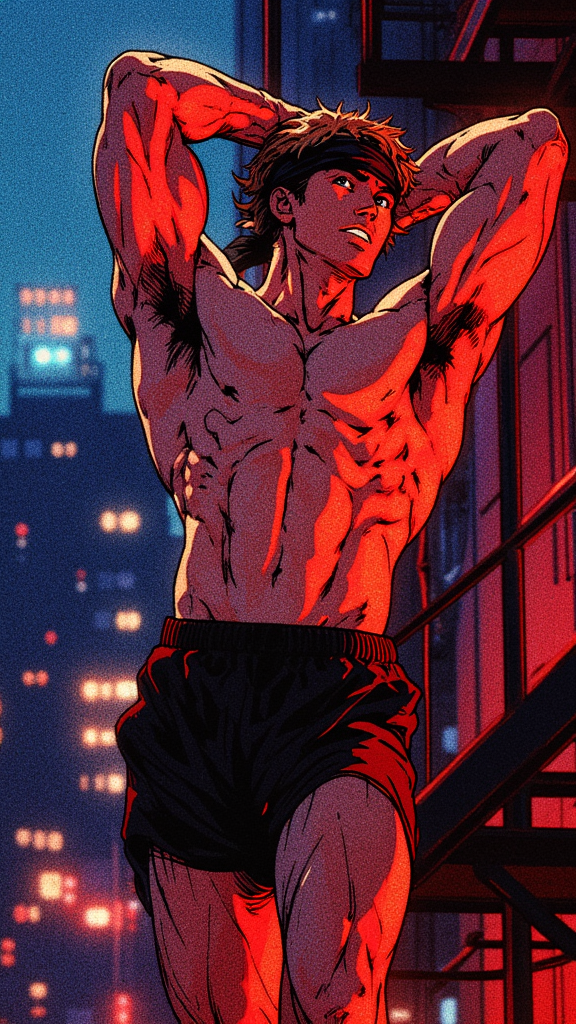 I had a dream... There's this really hot guy that goes jogging at night. He's young and masculine, and wears a pair of black mesh translucent running shorts, split on the sides with a 3 inch inseam. He's very fit and always goes shirtless. When he gets back from his run, he goes to the fire escape by his apartment and just stands out there, the neon signs in the city reflecting off his sweaty body, the air cooling him off. A couple times he caught me looking at him-- he says nothing, but smiles back and stretches so that I can see more of his body, arms up and armpits damp with sweat, perspiration running down his face and chest, the strength of his long sinewy legs, the bulge in his groin, his shorts barrly containing his flaccid girth. His bright blue eyes looking back at me. I know that one night soon I'm going to join him on that fire escape and examine him more closely... {{{ Caucasian masculine male, light brown hair wavy fade hairstyle, short on sides and back, longer on top. Black bandana tied around his forehead, strong brow and jaw, sparkly blue eyes. Muscular sinewy body, wide back, broad chest, wide shoulders, narrow waist, gymnast build , strong powerful legs. Sheer black mesh running shorts, very brief and somewhat revealing. Black running shoes, short white socks. Profusely sweaty body, neon lights reflecting off his skin. Slightly hairy legs and arms, a little hair on his chest. Full body pose, stretching and flexing on fire escape, arms up and sweat running down his armpits.}}} {{{MASTERPIECE}}}