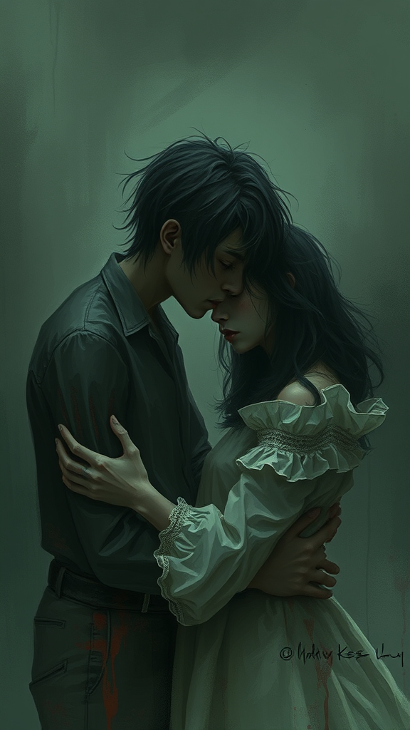 I just wanted to love you and nothing more, a heartbreaking composition with a nostalgic illustration. A digital painting that is dramatic and gloomy, emotionally profound, with volumetric lighting and intense, brooding dark tones. It leaves an indelible and haunting impression on the psyche, unforgettable, a masterpiece of high quality. It features text with worst quality, low quality, jpeg artifacts, and an ugly, duplicate, morbid feel. The image portrays mutilated, poorly drawn hands and faces, with mutation and deformed, blurry features. Characters appear dehydrated with bad anatomy and proportions, showing extra limbs, cloned faces, disfigured and gross proportions, malformed limbs, or missing arms and legs. Elements include extra arms and legs, with long necks, integrated into the composition. It contains elements like a camera image, name, signature, watermark, logo, autograph, or trademark cut off or censored, and is marked by bad anatomy, body, face, teeth, and deformities.