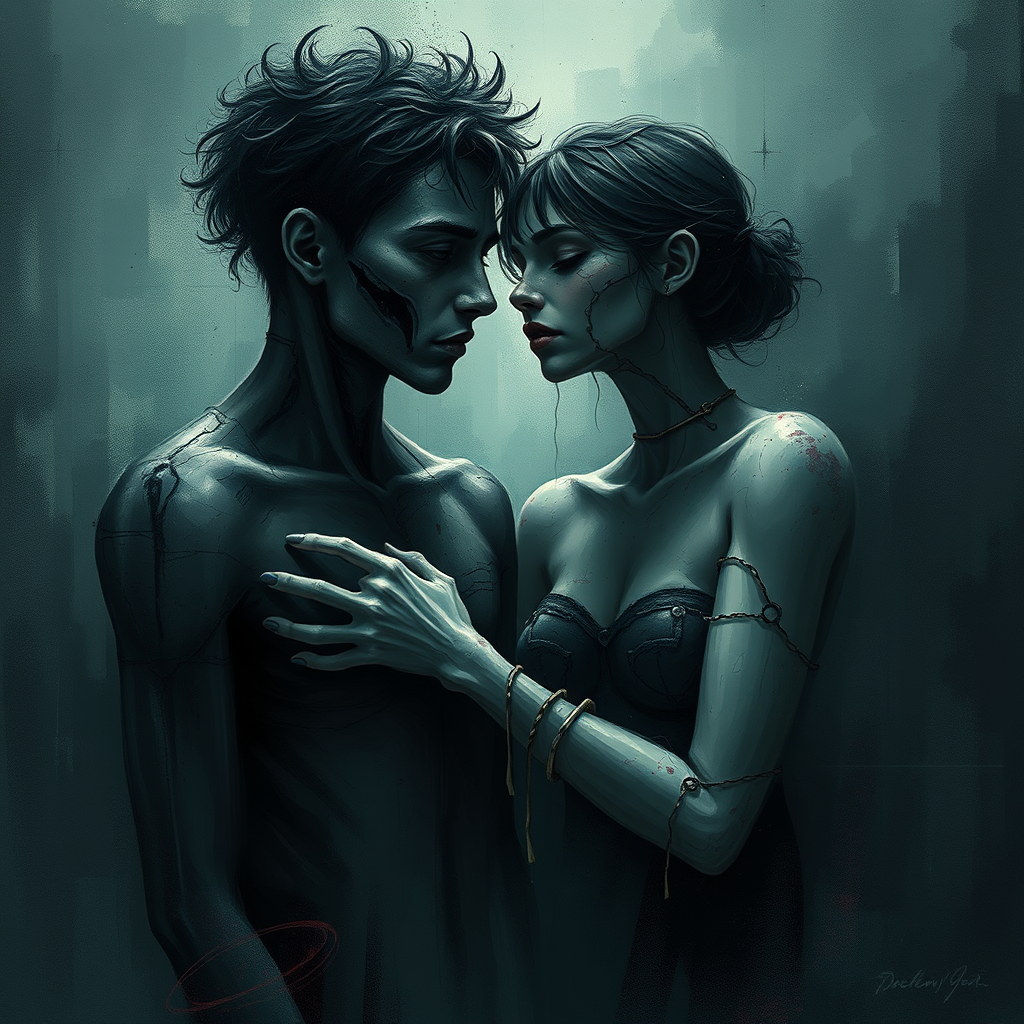 I just wanted to love you and nothing more, a heartbreaking composition with nostalgic illustration; a digital painting characterized by dramatic, gloomy, and emotionally profound elements. Bathed in volumetric lighting, it features intense and brooding dark tones, leaving an indelible and haunting impression on the psyche. An unforgettable masterpiece of high quality, it intentionally contrasts with low-quality text elements, manifesting jpeg artifacts and an intentionally ugly, duplicated, and morbid aspect. Featuring poorly rendered hands and faces with signs of mutation and deformation, this piece introduces blurry, dehydrated figures with bad anatomy and proportions. With extra limbs and cloned, disfigured faces, it portrays grossly malformed bodies with missing or extra arms and legs, elongated necks, and problematic anatomy. The image is strewn with partial camera captures, names, signatures, watermarks, logos, autographs, and trademarks, some cut-off or censored, contributing to the distorted portrayal of body and facial features, creating a uniquely unsettling atmosphere.