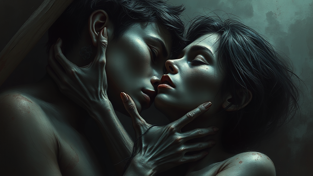 I just wanted to love you and nothing more, a heartbreaking composition featuring a nostalgic depiction, a digital painting with dramatic and emotionally profound elements. It is rendered in intense, brooding dark tones with volumetric lighting, leaving a haunting and indelible impression on the psyche. This unforgettable masterpiece is of high quality. The scene includes aspects that seem unsettling, such as distorted and deformed anatomy, with poorly drawn, blurry features, adding to the morbid atmosphere. Details like extra limbs or malformed proportions contribute to the eerie feel. Despite these imperfections, the artwork conveys its emotional depth without text, signatures, or watermarks, maintaining its focus on the evocative imagery and visceral emotional impact.