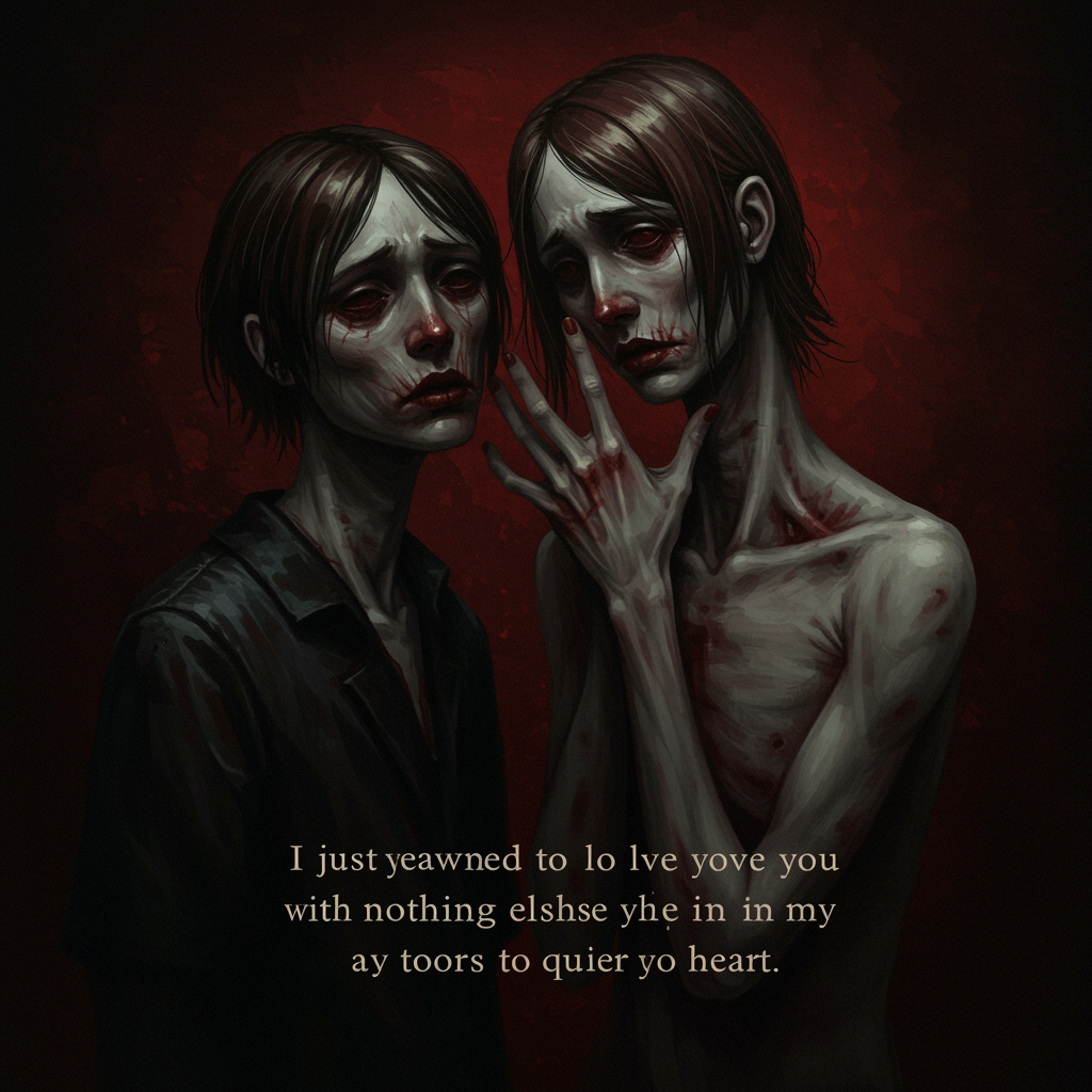 I just yearned to love you with nothing else in my heart, creating a poignant composition, a nostalgic illustration with digital painting techniques that exude drama and somberness, evoking deep emotion and featuring volumetric lighting. It combines intense, brooding dark tones that leave a lasting and haunting impact on the psyche, crafting an unforgettable masterpiece with high quality. Alongside this, there are elements of text that suggest worst quality, including the presence of jpeg artifacts, unattractive and duplicated forms, and morbid, mutilated elements. The artwork includes poorly rendered features such as hands and faces that appear mutated or deformed, with a blurry or parched appearance. The anatomical structure is flawed, displaying bad proportions, additional limbs, cloned or disfigured features, and grossly misformed elements like malformed limbs or missing body parts. These imperfections hint at long necks, with extraneous elements like cameras, names, signatures, watermarks, logos, autographs, trademarks, and cut-off or censored segments, all contributing to a depiction of defective anatomy, body, and features marred by deformities.