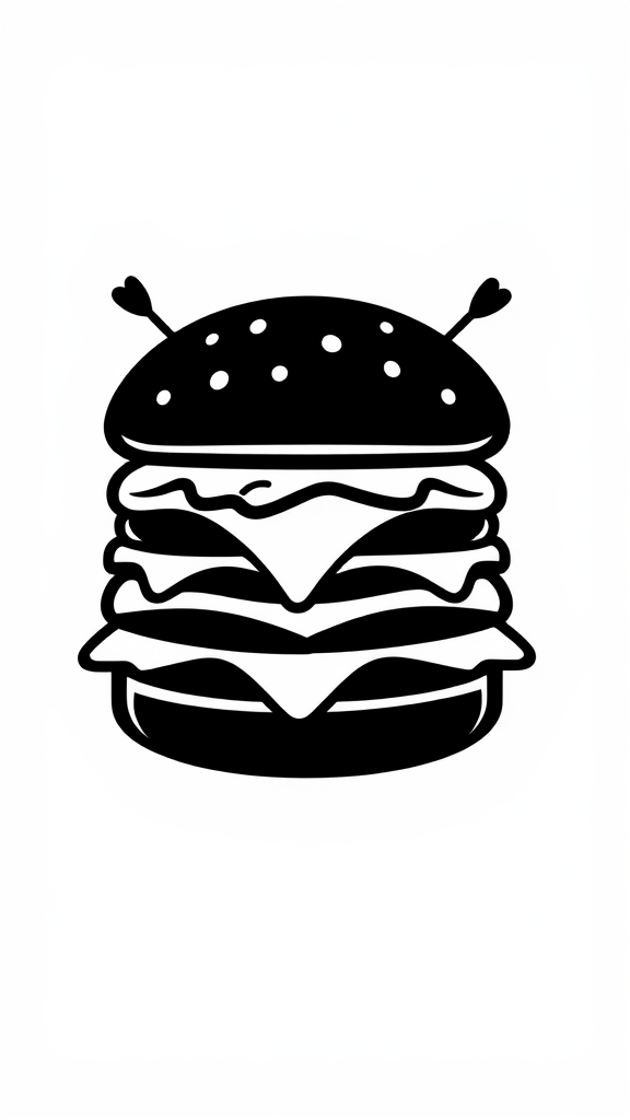 Iconic bold black vector logo of a cheeseburger with stylized features and artistic flair, set against a crisp white background, featuring subtle unique design elements to enhance visual impact.