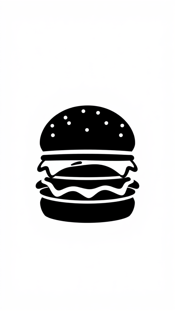 Iconic bold logo of a cheeseburger, black silhouette on a white background, featuring sharp lines and a modern twist, with minimalist and stylish elements to enhance its classic appeal.