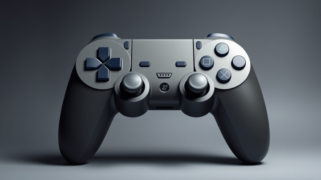 Iconic game controller logo, crafted in the style of minimalist sculpture with dark gray and navy tones, showcasing precise perspective. Inspired by engineering, construction, and design elements; tactile and reminiscent of Henry Moore's abstract form. Subtle creative adjustments enhance the core concept while maintaining its essence.