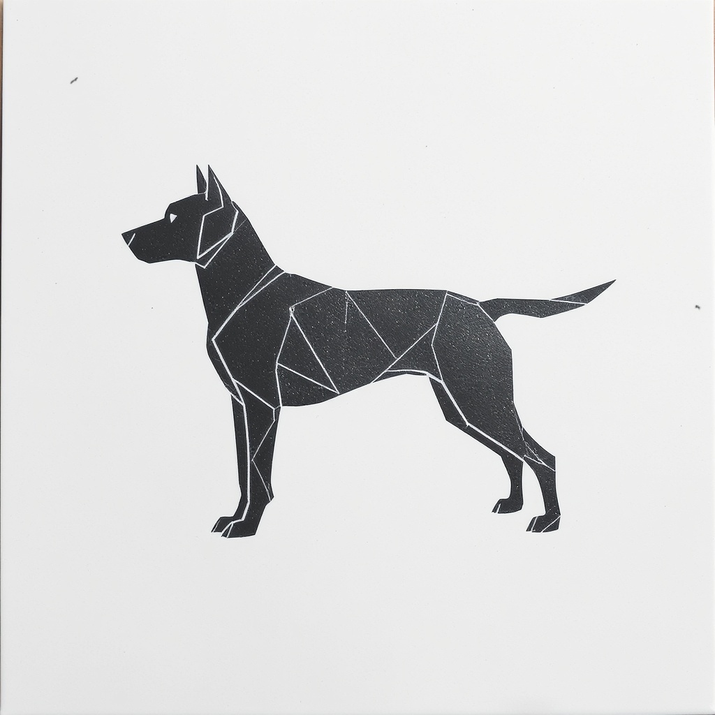 Iconic silhouette of a dog, minimalist black line art, on a clean white background, featuring unique geometric elements subtly incorporated into the design.
