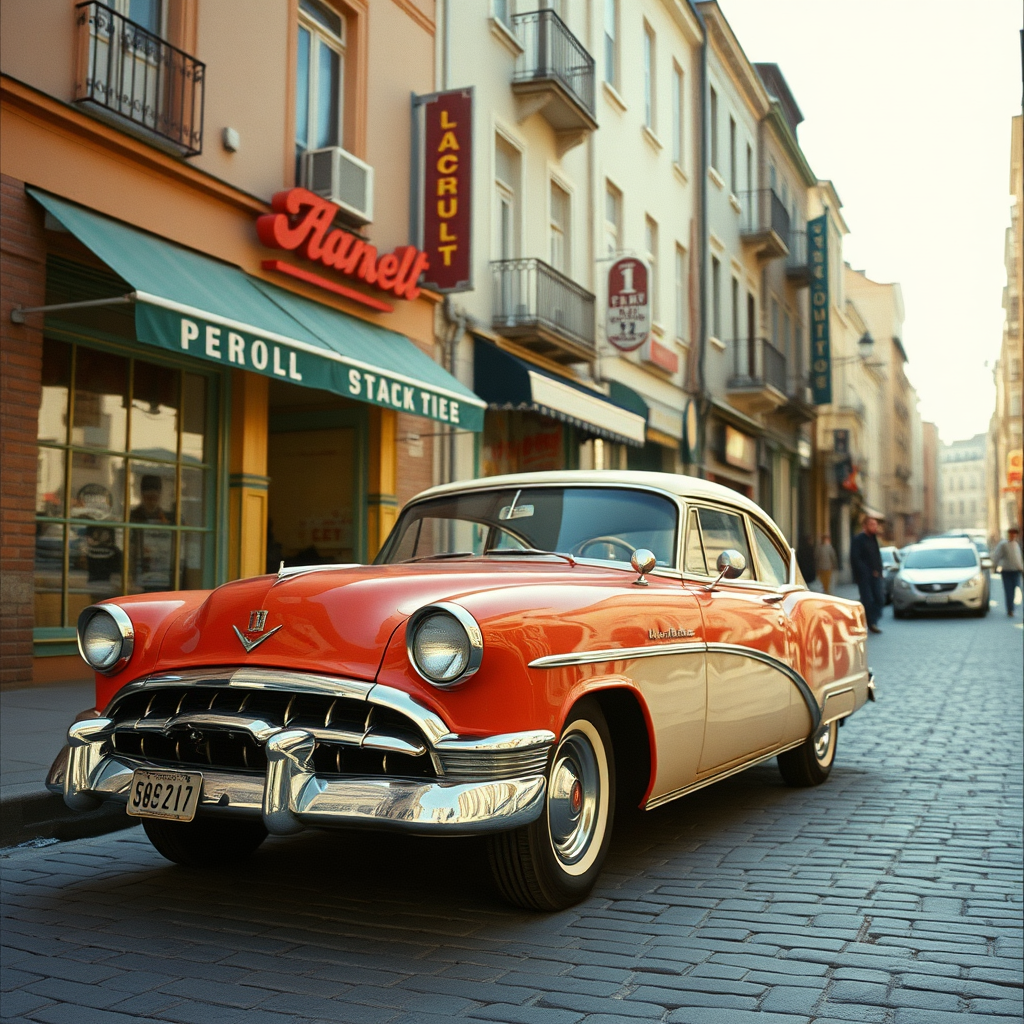 Iconic vintage car surrounded by nostalgic urban setting captured with a 90s flair, vibrant colors and sunlit reflections enhance the timeless chrome, cobblestone streets and retro storefronts in the background add authentic charm, shot in rich, crisp 35mm detail for a cinematic feel.