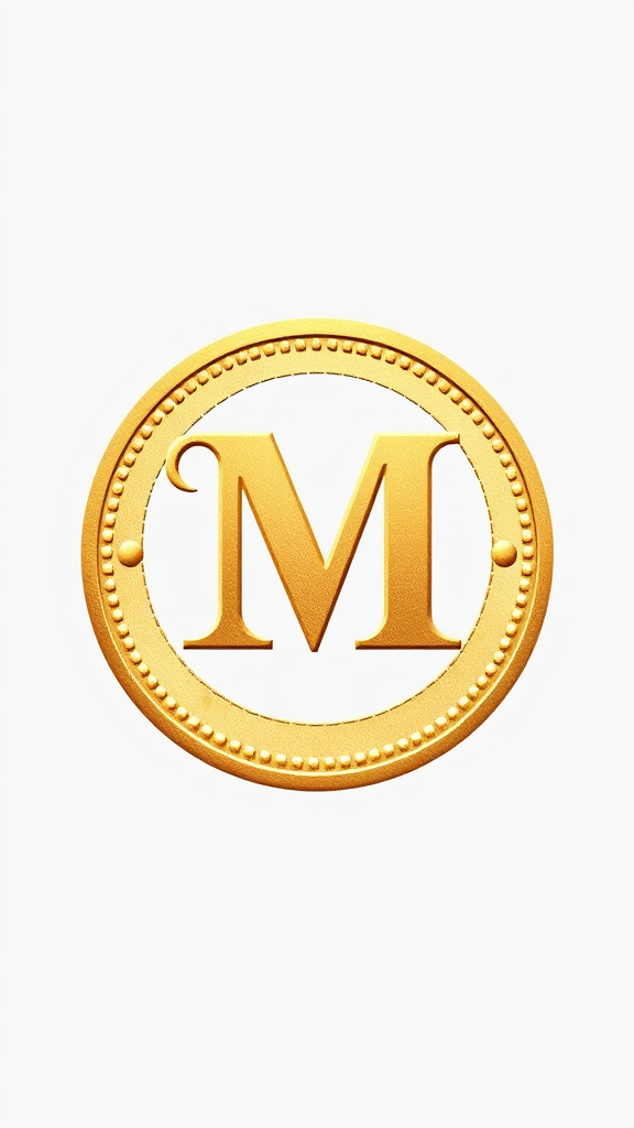 Iconic vintage logo of the letter M on a coin, predominantly in soft gold and mustard hues with delicate gradients, set against a clean, white backdrop; include intricate detailing and subtle textures for a timeless look.