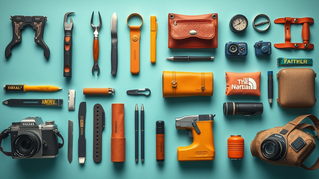 Ideal adventurer tools arranged meticulously in a Wes Anderson-inspired color scheme, with soft studio lighting and subtle contrast, captured in ultra-high-definition.