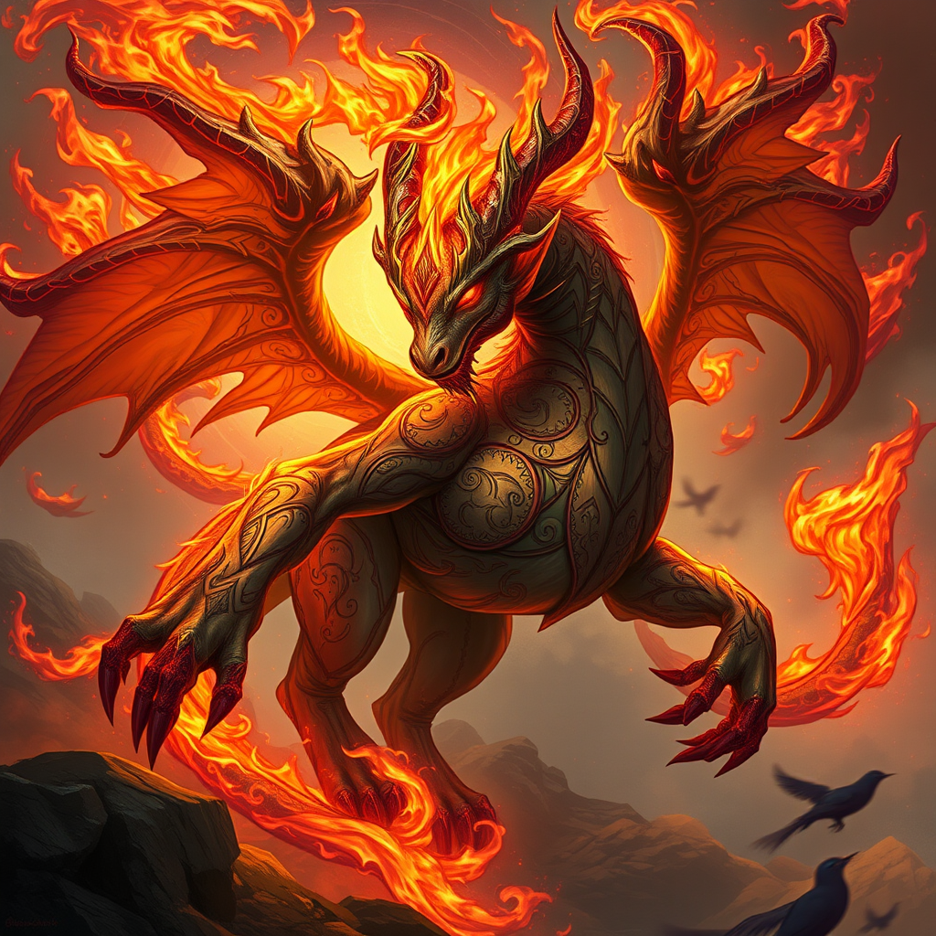 Ifrit creature from fantasy realms, inspired by final fantasy and d&d themes, intricate and elegant design, highly detailed digital painting, artstation quality, concept art style with matte finish, sharp focus illustration, reminiscent of hearthstone art style. Influences from artgerm, greg rutkowski, and alphonse mucha. Rendered in 8k resolution, capturing the mythical essence, surrounded by a mystical aura, vibrant flames swirling, with ornate patterns woven into its form, exuding an air of power and grace amidst a fantastical landscape.