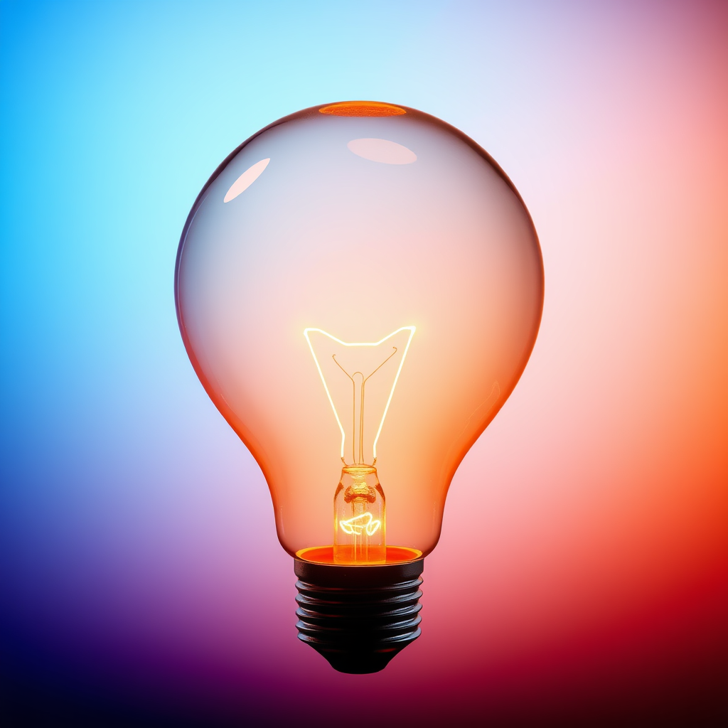 Illuminated bulb icon with soft glow, featuring a whimsical filament design forming the shape of a pencil. The glass surface displays subtle texture, set against a gradient background that transitions from deep blue to vibrant orange, symbolizing creativity and ideas.