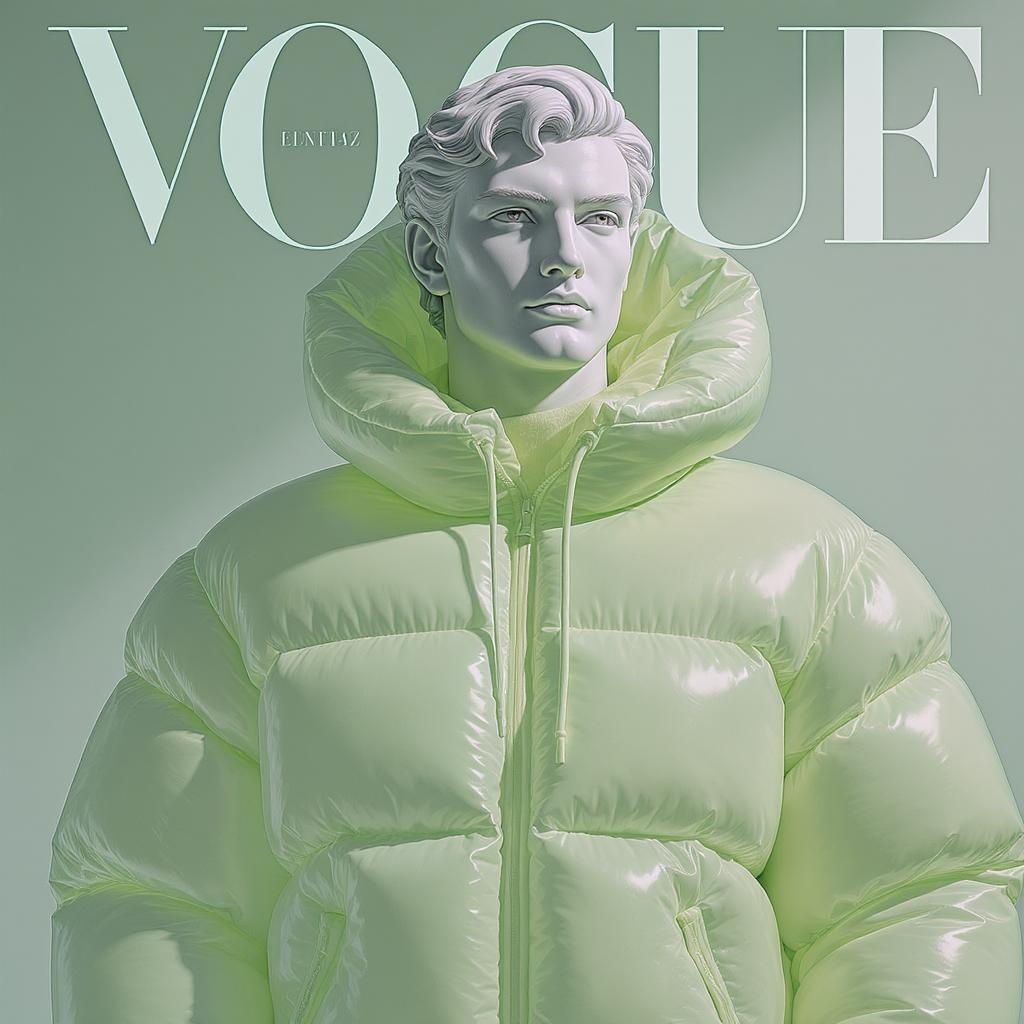 A vividly illuminated fashion portrait of a strikingly handsome marble statue of a man, adorned in a light green inflatable bubble outfit designed by Dingyun Zhang, reflecting influences from Yeezy, Balenciaga, Vetements, and A Cold Wall. The composition is in sharp focus, with exquisite detail and a cinematic allure, exuding glamour and symmetry akin to a Vogue editorial shoot. This image resembles a fashion magazine cover, capturing the essence of high-fashion editorial photography.