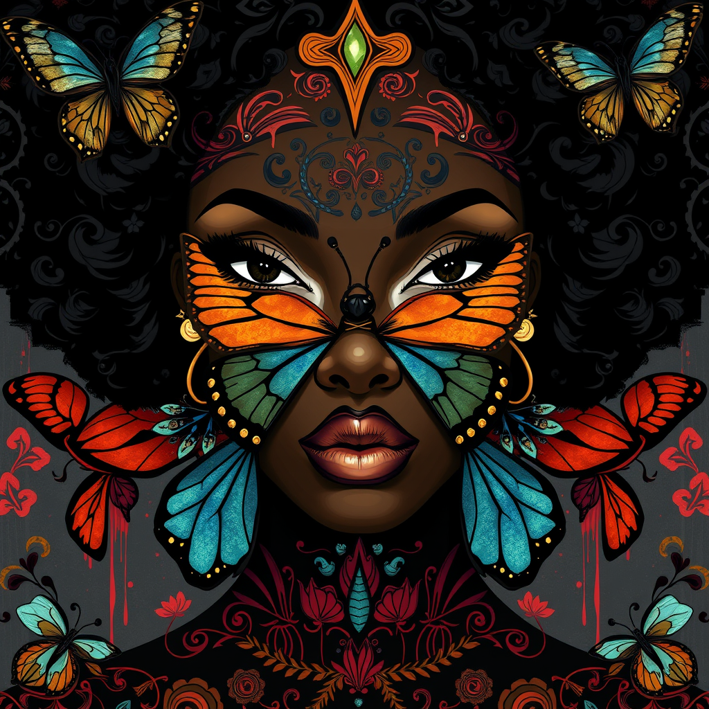 Illustrate a black woman in an opulent painting style, drawing inspiration from the likes of Tom Bagshaw, Greg Rutkowski, Makoto Shinkai, Lois Van Baarle, and Ilya Kuvshinov. Emphasize a symmetrical composition featuring a Damascus butterfly pattern, rendered as a high-quality, intricate vector illustration with ultra-precise strokes. Use a luxurious color palette with strategic splashes of color and incorporate elements of oil painting with heavy strokes and paint dripping effects. Ensure the depiction is seamless, detailed, and retains sharp edges, portraying beauty and poise. Avoid any distortions in anatomy or proportions, ensuring clarity and elegance.