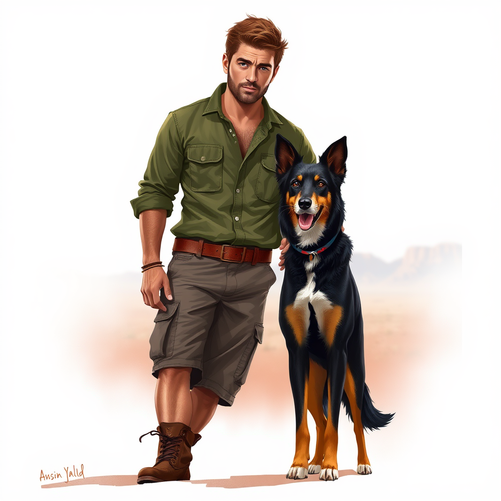 Illustrate a captivating phone case design featuring an Australian man in his late 20s or early 30s, embodying the rugged spirit of adventure. He boasts a strong, athletic build with sun-kissed, weathered skin, and a face that tells stories of the outdoors, with a chiseled jawline, light stubble, and vivid blue eyes exuding confidence. His short, wind-tousled hair glistens with natural brown highlights. Wearing an olive-green shirt with rolled-up sleeves revealing muscular forearms, and weathered khaki cargo shorts, he's dressed for adventure, boots dirtied from the trail, a brown leather belt with a multi-tool and flashlight. He stands tall, relaxed, with one hand gently resting on his loyal Australian Kelpie. The dog's glossy black and tan coat shines in the light, its ears perked, eyes alert with intelligence. They stand on a minimalistic white backdrop hinted subtly with the Australian outback's essence—blurred red earth and whispering silhouettes of distant mountains. The scene is bathed in natural, warm lighting, drawing out earthy tones in the man's attire and the sleekness of the dog's form, casting gentle shadows that highlight their strength. This illustration captures the adventurous bond between man and dog, celebrating loyalty, courage, and the connection to the Australian wilderness, making it a compelling phone case for anyone drawn to the rugged outdoor lifestyle.