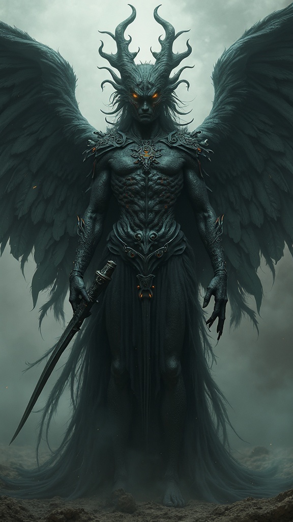 View this AI-generated image featuring a masterfully illustrated composition capturing the essence of a fallen angel imbued with the formidable characteristics of a dark spirit seamlessly integrating human and hybrid creature elements invoking a profound sense of mystery the depiction showcases intr