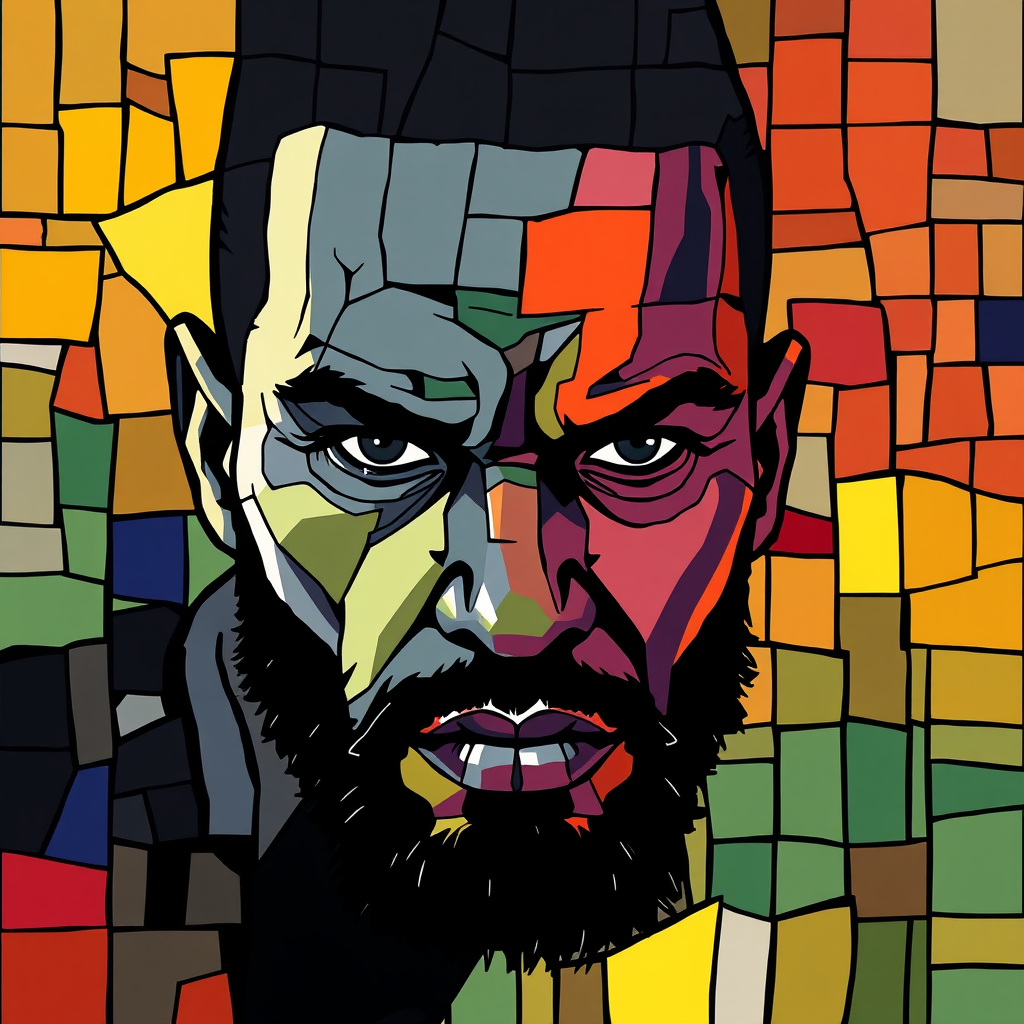 Illustration art featuring a man's face with an intense gaze, rendered in a mosaic style reminiscent of Mondrian, incorporating an array of random colors with bold black outlines. The pattern weaves into a vibrant masterpiece, capturing the raw essence of creativity and expression.