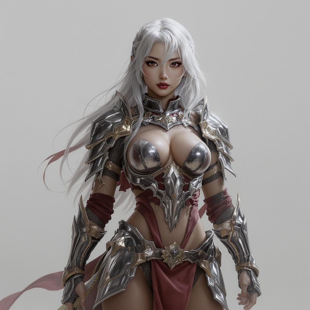View this AI-generated image featuring a stunning illustration of a young asian girl warrior showcasing a detailed and captivating face with striking olive skin her medium length silver white hair flows elegantly complementing her intricate revealing armor the artwork is crafted in a hyperrealistic