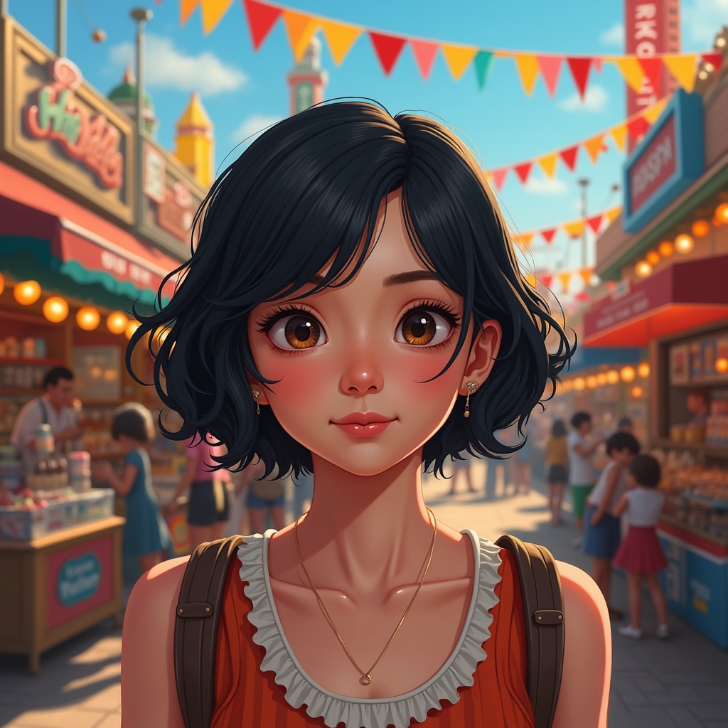 View this AI-generated image featuring a vibrant illustration capturing daisy ridley at an amusement park exuding a sense of wonder as she gazes at the camera her short dark hair frames her face amidst a lively backdrop of merchant stalls filled with food and souvenirs overhead colorful banners flut