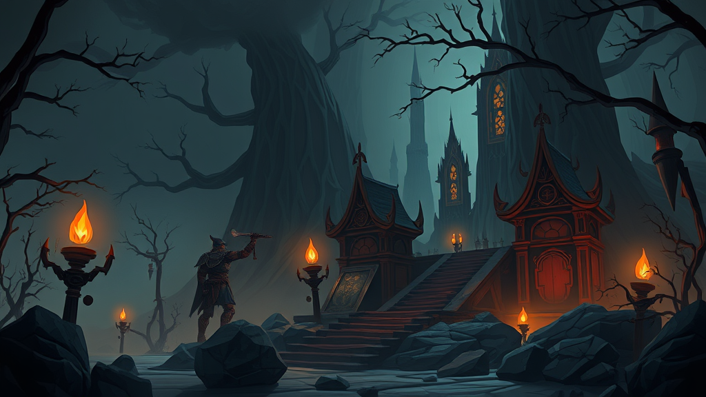 Illustration cartoon style featuring dark colors and soothing tones, capturing an epic and realistic atmosphere reminiscent of Diablo 4, with imaginative elements enhancing the mysterious and immersive environment.