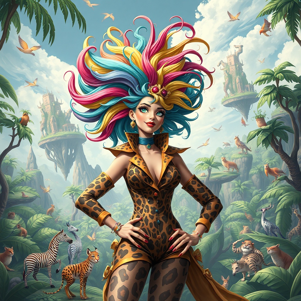 View this AI-generated image featuring a fanciful and surreal illustration depicts a safari queen drawn from dr seuss inspirations clad in an eccentric mix of animal prints and wild designs her swirling hair bursts into a kaleidoscope of vibrant colors and she radiates self assurance with a powerful