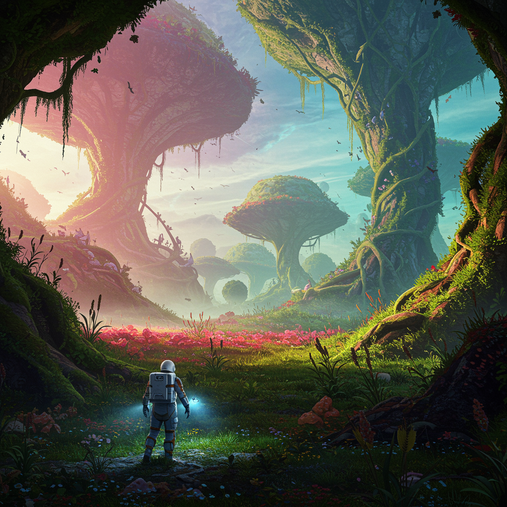 A breathtaking illustration of an astronaut exploring a lush and verdant alien world, crafted as a sci-fi masterpiece with atmospheric depth and stunning detail. The scene captures the intricacy of the landscape with vibrant flora stretching towards a brilliantly colored sky. Each element is in sharp focus, revealing the intricate textures and patterns of the environment. The artwork is rendered in 4k resolution, designed to evoke a sense of wonder and adventure, and is trending on art platforms like ArtStation. The composition includes dynamic lighting effects and captivating contrasts that highlight the beauty and mystery of this extraterrestrial paradise, inviting viewers to lose themselves in the vivid intricacies of this imaginative realm.