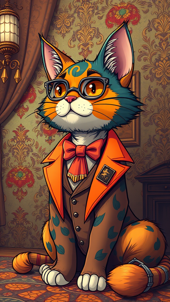 Illustration of a dapper feline character, designed in the style of 2D game art. The cat is adorned in a cyan and orange palette, exuding a necropunk aesthetic. The background features intricate tapestries and detailed wood textures, all combined to create a sense of luxury and elegance. The scene is whimsical and vividly illustrated, capturing a playful yet sophisticated vibe. The composition embraces a high level of creativity and chaos, embodying an immersive, narrative-driven visual experience.