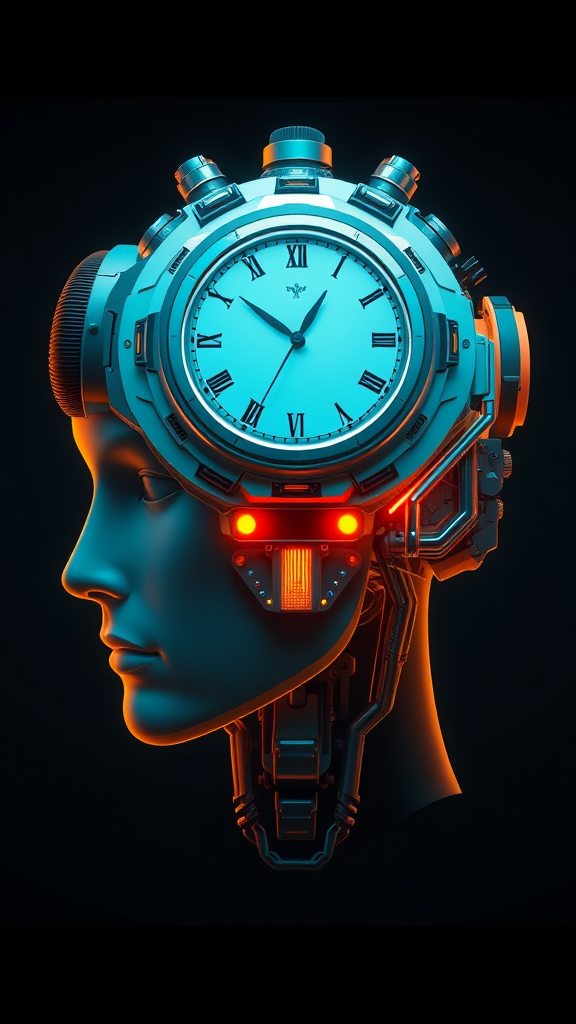 Illustration of a futuristic head with a clock integrated on top, showcasing realistic hyper-detailed rendering with mechanized precision. The color scheme features cyan and amber, embodying a symmetrical lowbrow style. The design incorporates advanced machinery elements, rendered with Daz3D influences, exuding a refined yet raw aesthetic within a 51:91 aspect ratio and a softness of 750.
