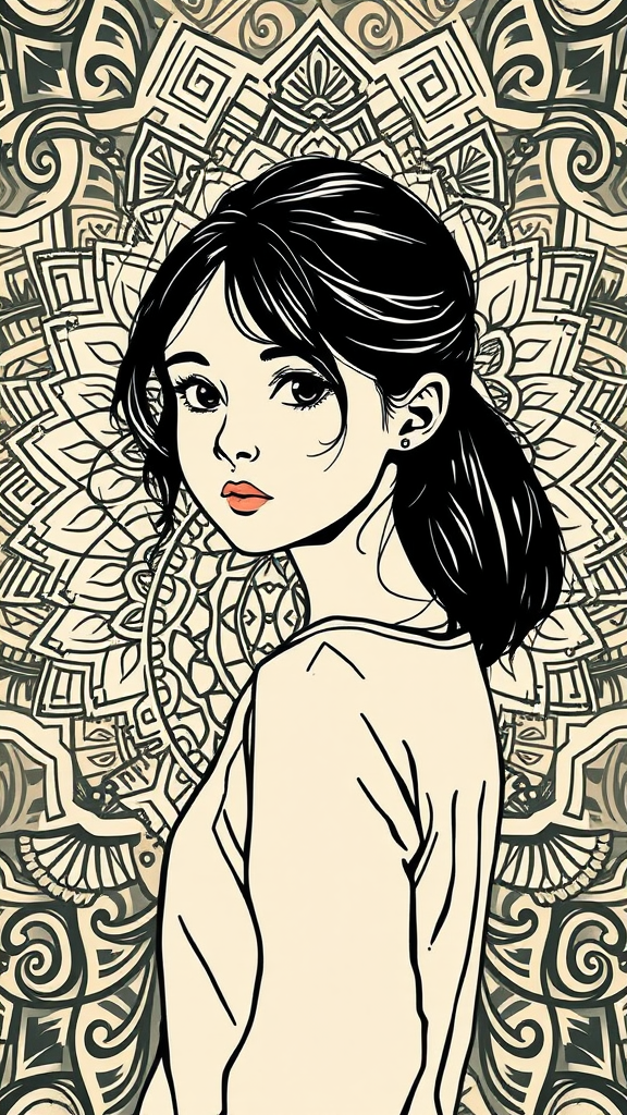 Illustration of a girl from the waist up, facing forward with a captivating gaze. Rendered in raw style, the piece employs a maximum of three distinct colors, chosen at random, to create striking contrast. The composition features bold outline and edge lines to define the figure, set against a backdrop of intricate, harmonious patterns. Designed as an original masterpiece, this artwork captures a fusion of simplicity and depth. The overall aspect ratio is defined as 9:16, adding an elegant verticality to the portrait.