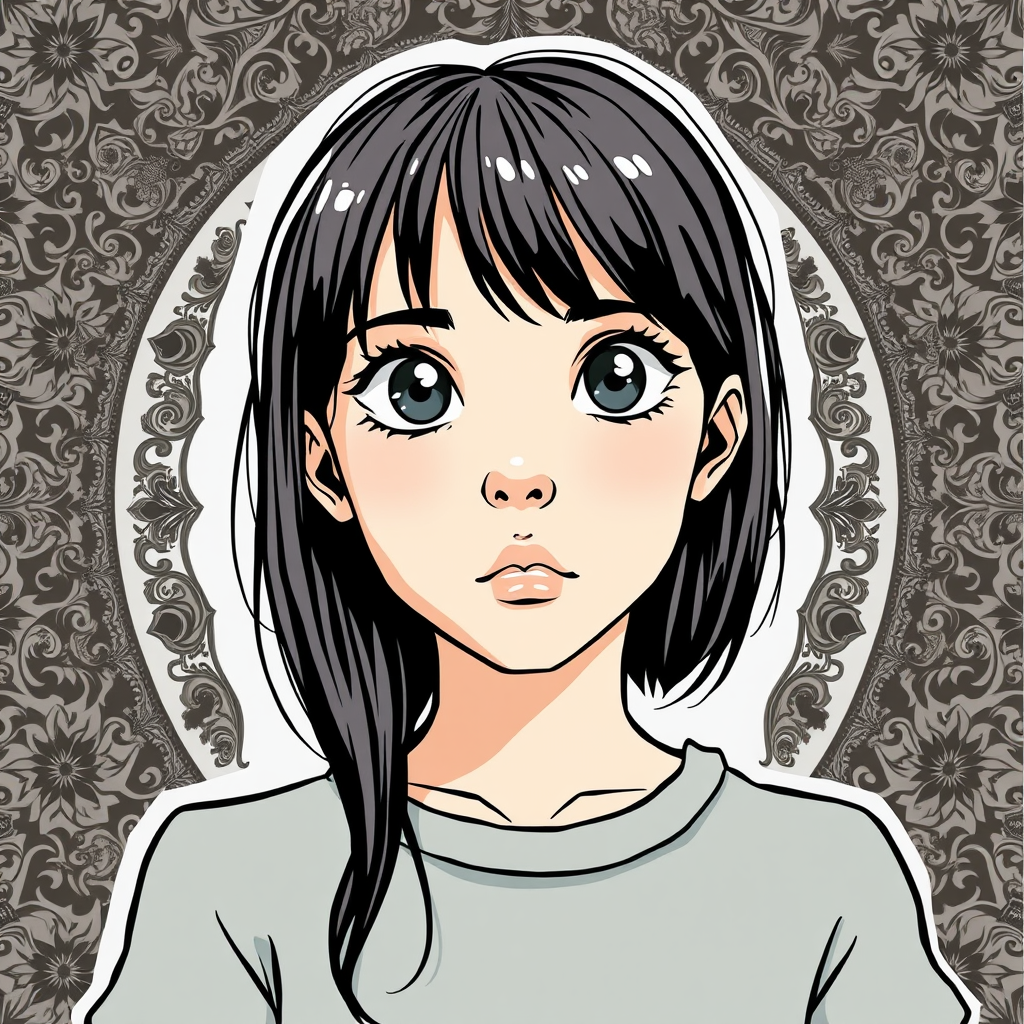 Illustration of a girl's upper body, facing front with a captivating gaze, limited to two or three colors selected at random. The composition features distinct outlines and edge lines, set against a backdrop with intricate patterns. This original masterpiece captures raw style and creativity.