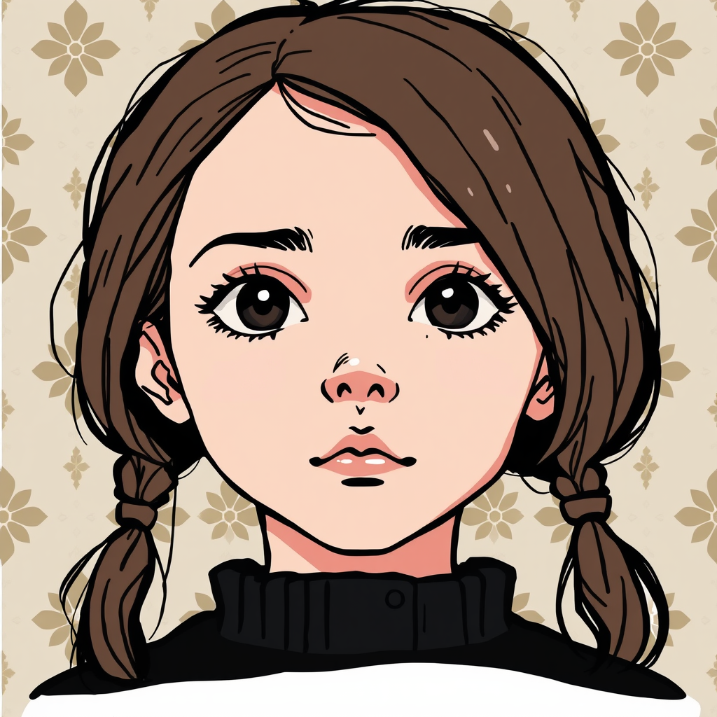Illustration of a girl's upper body with a focused gaze, utilizing a palette of two or three random colors with defined outline and edge lines. The background features a unique pattern that complements the composition, resulting in an original masterpiece. The aspect ratio is 9:16, embracing a raw and stylized aesthetic with a creative flair.