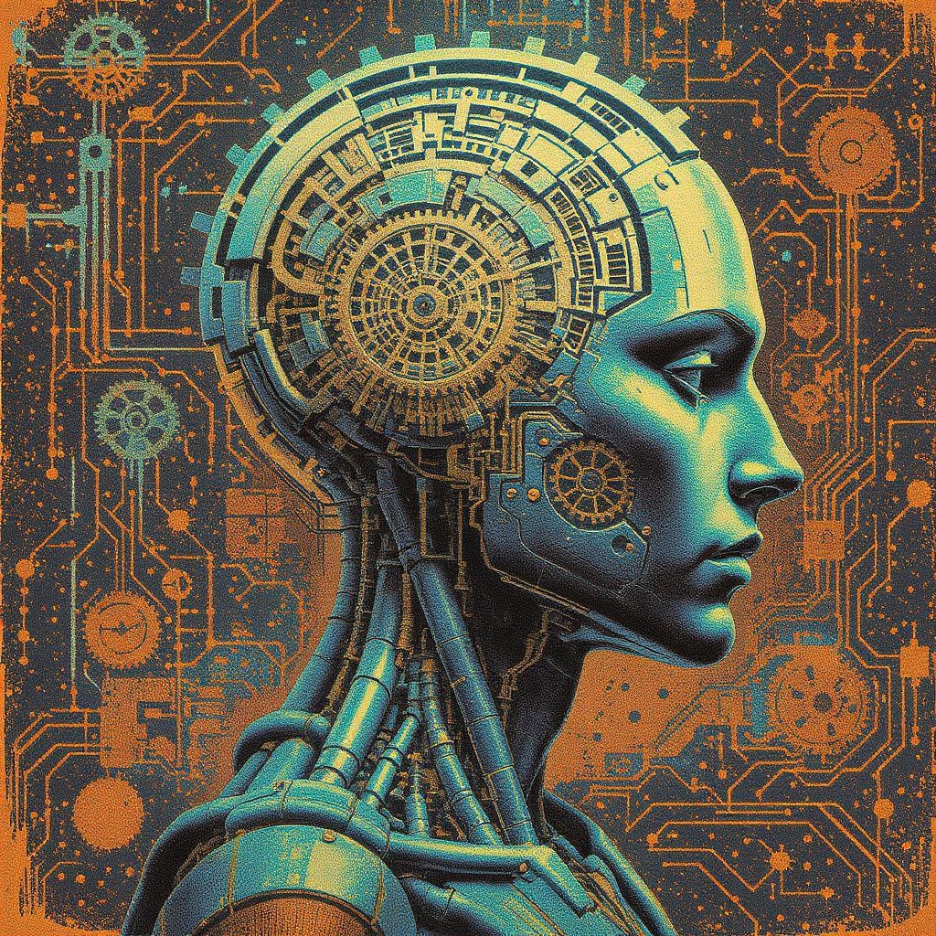 Illustration of a human head topped with an intricate clockwork mechanism, featuring a futuristic design. The hyper-detailed rendering showcases a blend of cyan and amber tones, emphasizing mechanized precision. The style reflects a symmetrical structure with a lowbrow aesthetic, resembling a complex contraption. The rendering conveys a balance between organic and mechanical elements, revealing gears and circuit-like patterns. The scene is envisioned with a raw, daz3d-inspired texture, maintaining the essence of advanced technology fused with human elements.