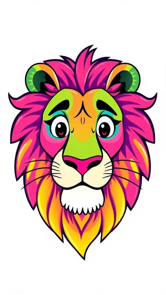 Illustration of a lion head featuring a vibrant and whimsical color palette, with a playful and cartoon-like style, showcasing exaggerated features and bold, unexpected colors such as turquoise, magenta, and lime green to create a fun and captivating appearance.