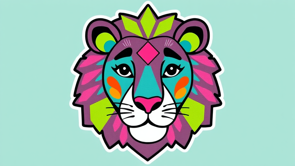 Illustration of a lion head sticker, drawn in a playful style with bold, vibrant colors such as teal, magenta, and lime green, featuring geometric shapes and whimsical patterns, maintaining a simple yet captivating design.