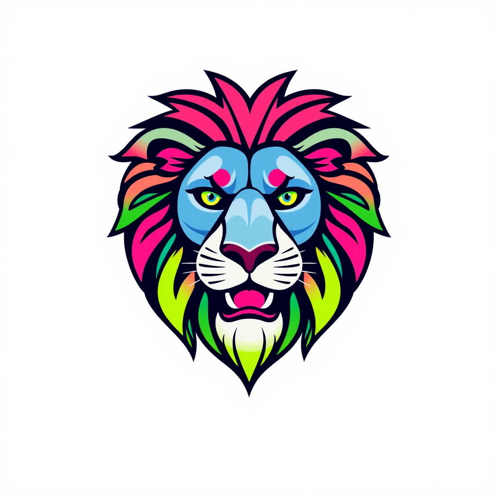 Illustration of a lion head with a whimsical style, featuring bold lines and vibrant colors like electric blue, neon pink, and lime green, set against a minimalistic background for a striking contrast.