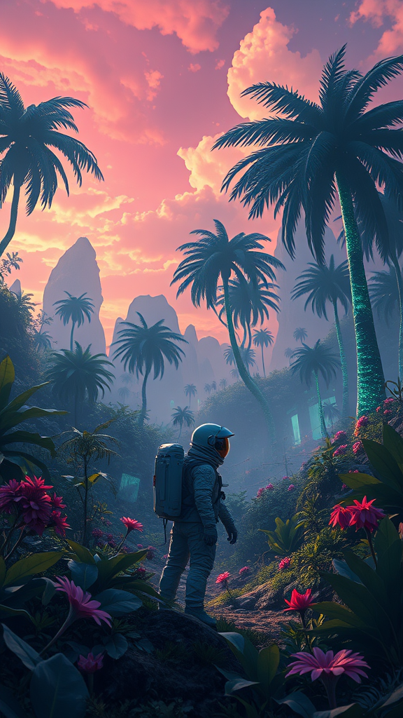 Illustration of a lone astronaut exploring a lush, verdant alien world, a masterpiece of sci-fi atmosphere, capturing every intricate detail in sharp focus. The landscape features vibrant flora and towering, bioluminescent trees, with a sky painted in mesmerizing colors. Each element carefully rendered in 4k resolution, echoing the trending styles on ArtStation. The scene radiates a sense of wonder and discovery, as the astronaut marvels at the alien environment, their reflective visor mirroring the breathtaking beauty around them.