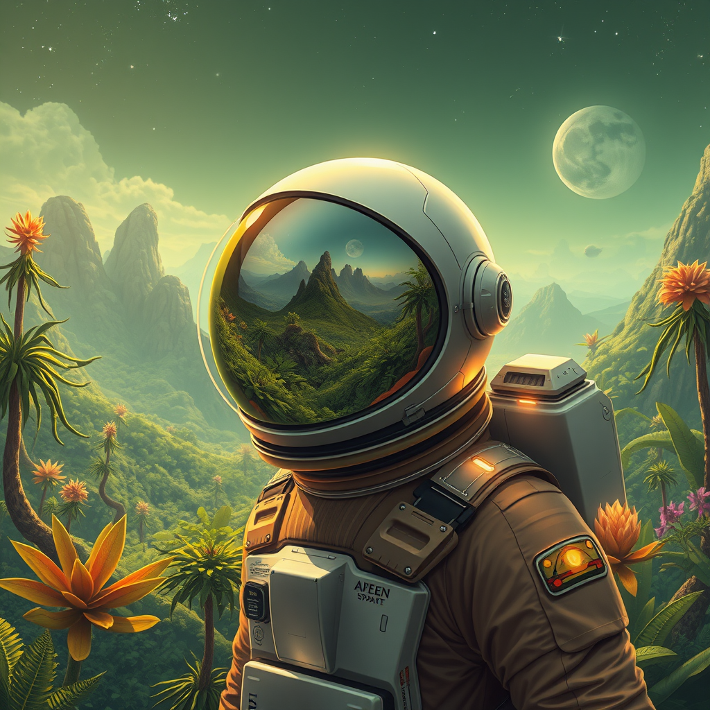 Illustration of a lone astronaut exploring an alien verdant world, showcasing a masterpiece of sci-fi atmosphere with lush green landscapes and vibrant, towering flora. The scene is highly detailed with a sharp focus on the astronaut's reflective helmet that mirrors the incredible vista. Intricate textures and vivid colors bring the environment to life, complemented by subtle luminescent elements on native plants. Bathed in the soft, otherworldly glow of a distant star, the composition captures a sense of wonder and discovery. Created in 4k resolution, this artwork is trending on ArtStation, showcasing the unique blend of realism and imaginative artistry.