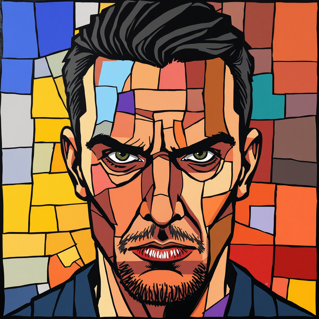 Illustration of a man's face with an intense gaze, rendered in a mosaic style reminiscent of Mondrian. The composition features random yet vibrant colors, bordered by bold black outlines, forming an intricate pattern. This imaginative masterpiece captures raw emotion and artistic expression.
