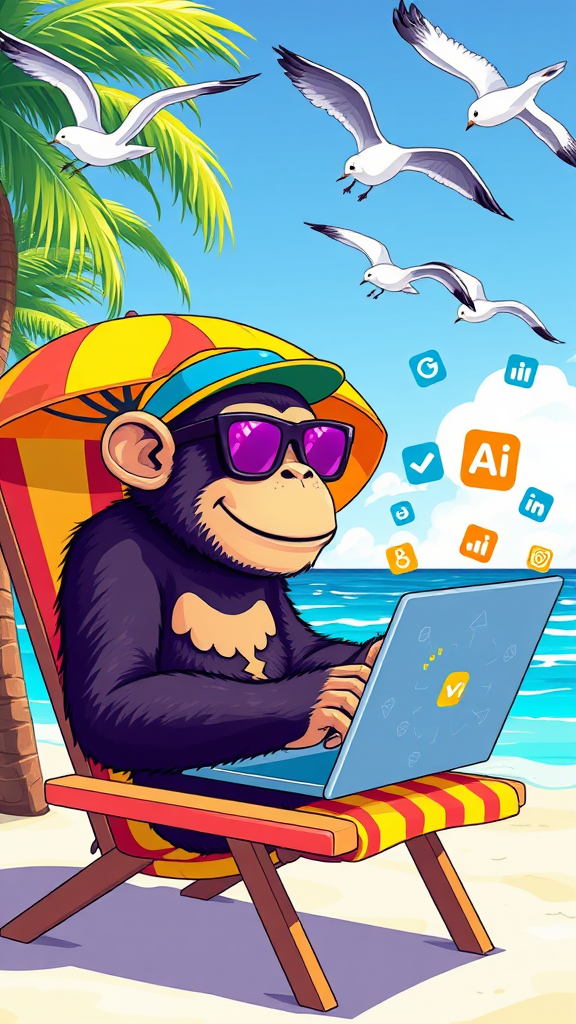 Illustration of a monkey wearing sunglasses and a colorful cap, sitting on a beach chair under a vibrant sun umbrella. The monkey is typing on a laptop, surrounded by palm trees and the ocean in the background. Various AI app icons float around the laptop screen, with seagulls flying overhead. The scene is depicted in vivid, bright colors with a playful and energetic vibe.