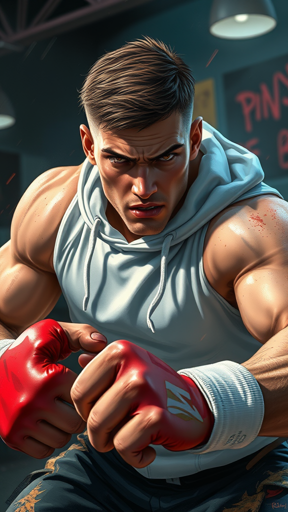 Illustration of a muscular young man with short brown hair, a tough and intense gaze, and strong, calloused hands, dressed in a white dragon hoodie. His appearance reflects that of a seasoned fighter, marked with scars and signs of battle on his face and body. Sweat glistens on his skin as he strikes a dynamic, epic action pose in a dimly lit boxing club setting, with a vivid sense of speed and blur capturing the fierce intensity of his movement. The style, influenced by Prokoko, is characterized by bold, expressive brushstrokes and vivid colors, heavily focused on a blood_red palette in line with CarnageStyle. The image has a cinematic quality, the lighting enhancing the dramatic, extreme details, with dynamic angles that amplify the sense of action and intensity. The background remains open to interpretation, adding an element of creative freedom while maintaining the core concept.