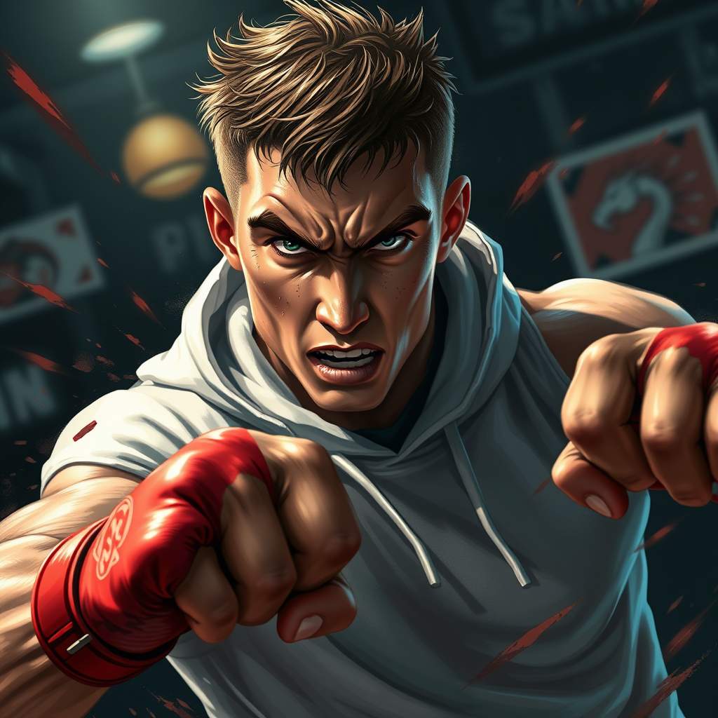 Illustration of a muscular young man with short brown hair, displaying a tough and intense gaze, his strong, calloused hands tearing through the air. He wears a white dragon hoodie, portraying him as a seasoned fighter with scars and fight marks on his face and body. Sweat glistens on his skin as he moves with the speed and blur effect of a dynamic epic action pose amidst a dark boxing club background, in the midst of a fierce battle. Painted in the style of Prokoko with bold, expressive brushstrokes and vivid colors, the scene radiates the modifier of CarnageStyle with an intense blood_red color scheme and an intensity setting of 1.6. The lighting is cinematic, capturing the raw emotion of the moment with a dynamic angle and extreme detail, leaving room for small creative changes while maintaining the core concept.