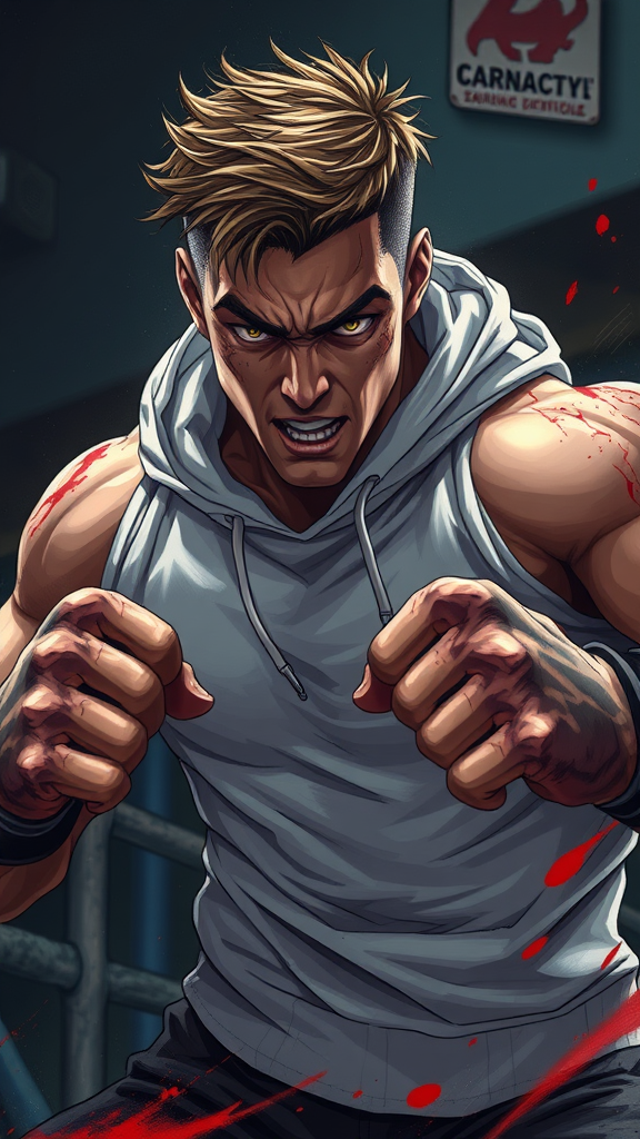 Illustration of a muscular young man with short brown hair, a tough and intense gaze, and strong, calloused hands, wearing a white dragon hoodie. He appears as a seasoned fighter with scars and marks of battle on his face and body, sweat dripping, in a dynamic, epic action pose. The scene captures him in the midst of a fierce fight set in a dark boxing club. The style is inspired by Prokoko, characterized by bold, expressive brushstrokes and vivid colors. The color theme is blood_red with an intensity of 1.6, while the lighting is cinematic, the angle dynamic, and the details extreme. The background, open to interpretation, enhances the drama and energy of the moment with a CarnageStyle twist.