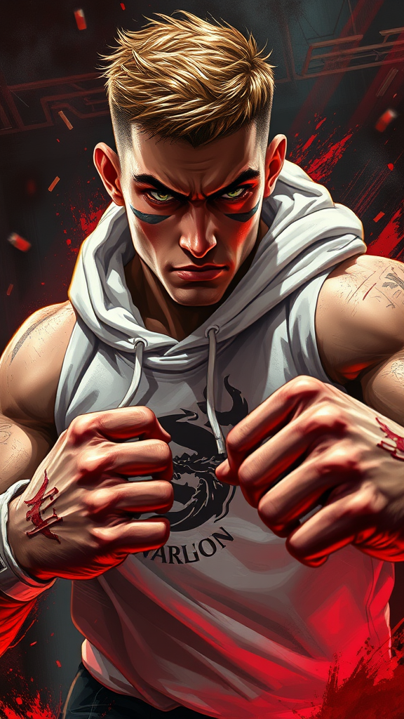 Illustration of a muscular young man with short brown hair, exhibiting a tough and intense gaze, and strong, calloused hands. He wears a white hoodie adorned with a dragon motif, exuding the aura of a seasoned fighter. His face and body bear the scars and marks of numerous battles. In the midst of a fierce fight, sweat glistens on his skin, captured in a dynamic epic action pose with speed and blur effects. The background hints at a dark boxing club, filled with tension and anticipation. Inspired by Prokoko's style, the painting features bold, expressive brushstrokes and vivid colors. Dominated by a blood_red palette and infused with CarnageStyle, the composition radiates an intensity of 1.6. The lighting is cinematic, casting dramatic shadows that heighten the tension. Viewed from a dynamic angle, every detail is rendered with extreme precision, capturing the raw emotion and power of the moment. The background remains open to interpretation, enhancing the figure's commanding presence.